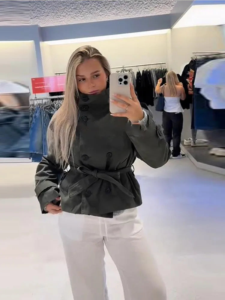 Belted Waist Cropped Trench Double Breasted Stand Collar Coat