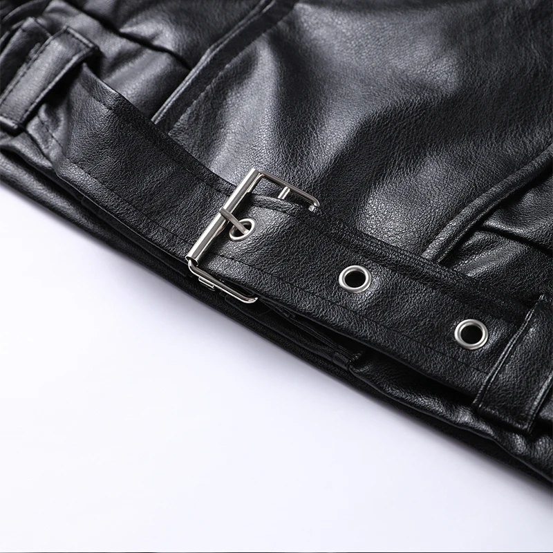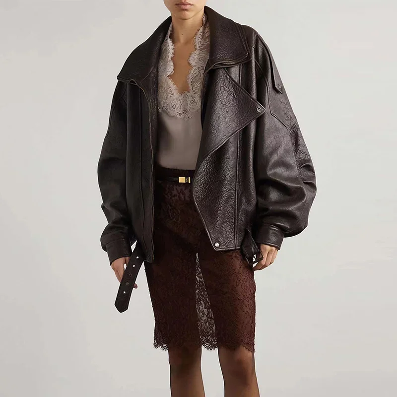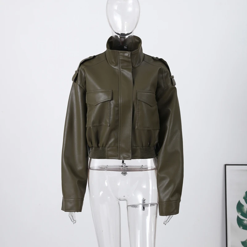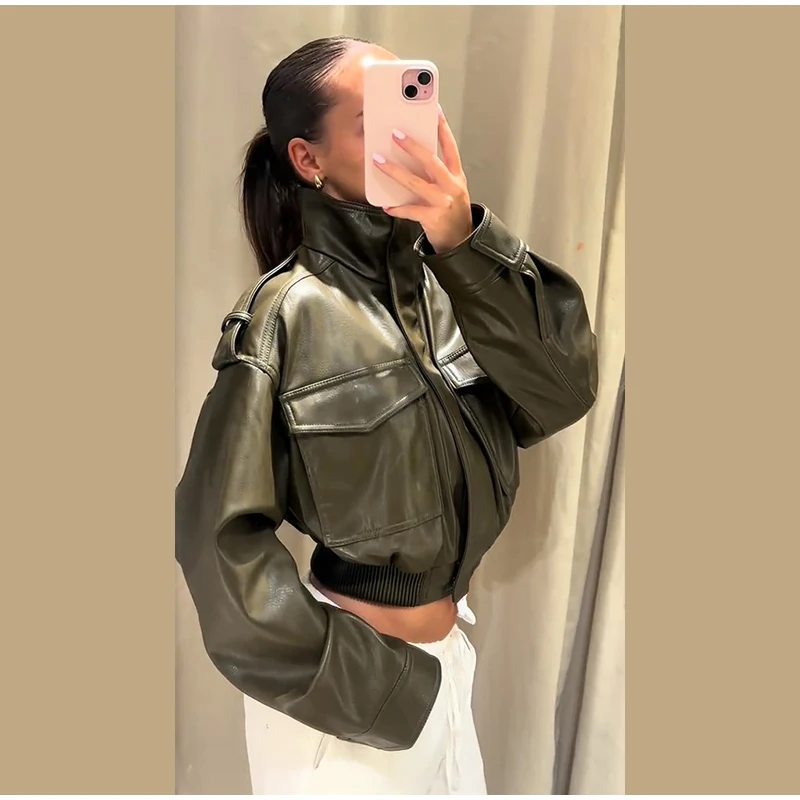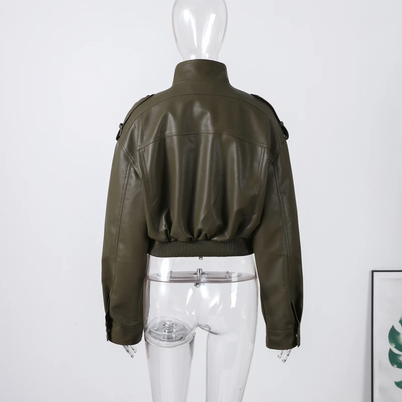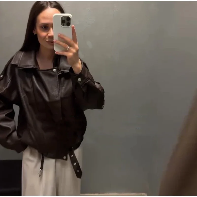 Vintage Zippers Short Leather Jackets Women's Casual Lapel Button Pockets Full Sleeve Coat 2025 Autumn New Lady Chic Streetwear
