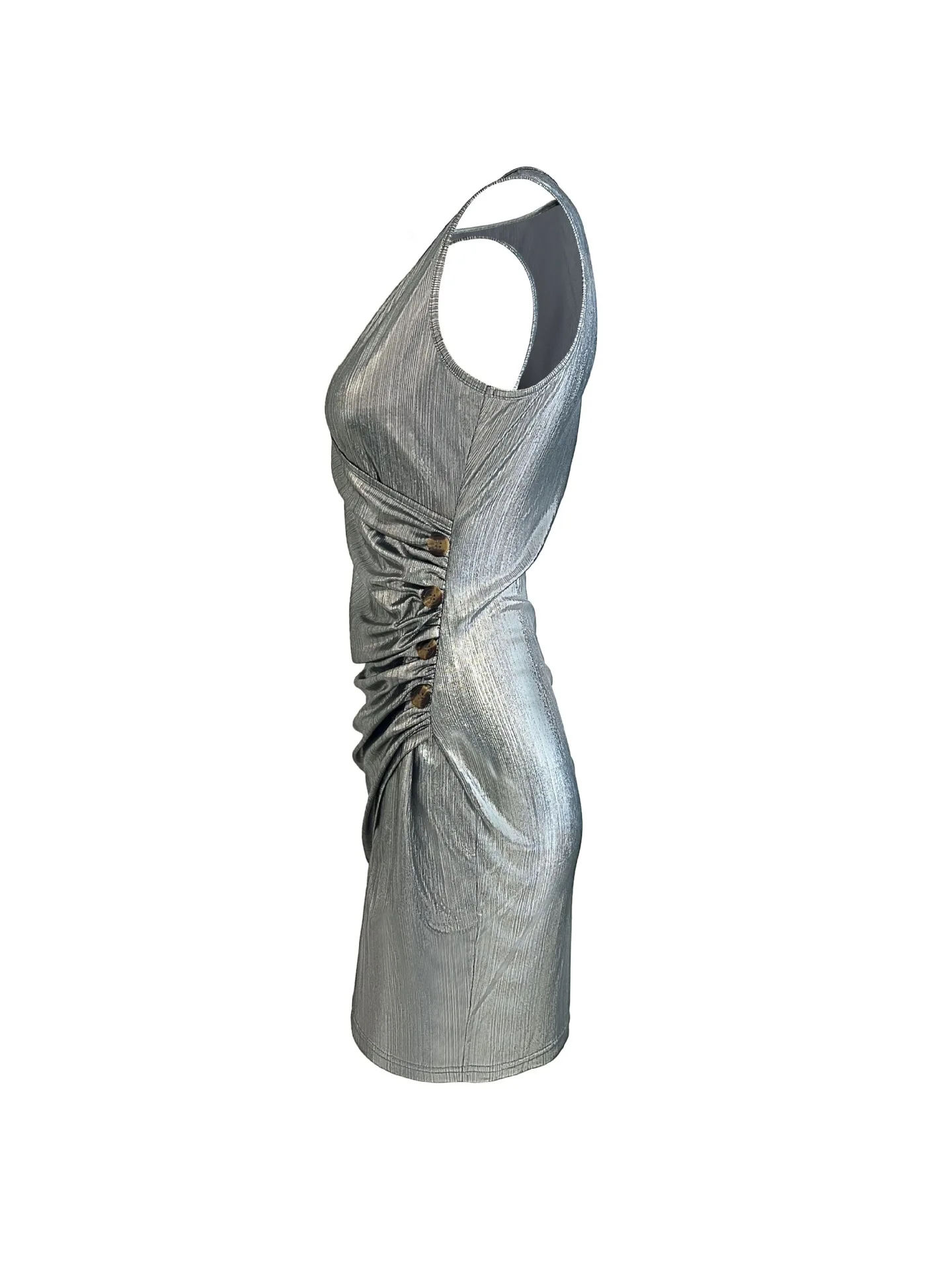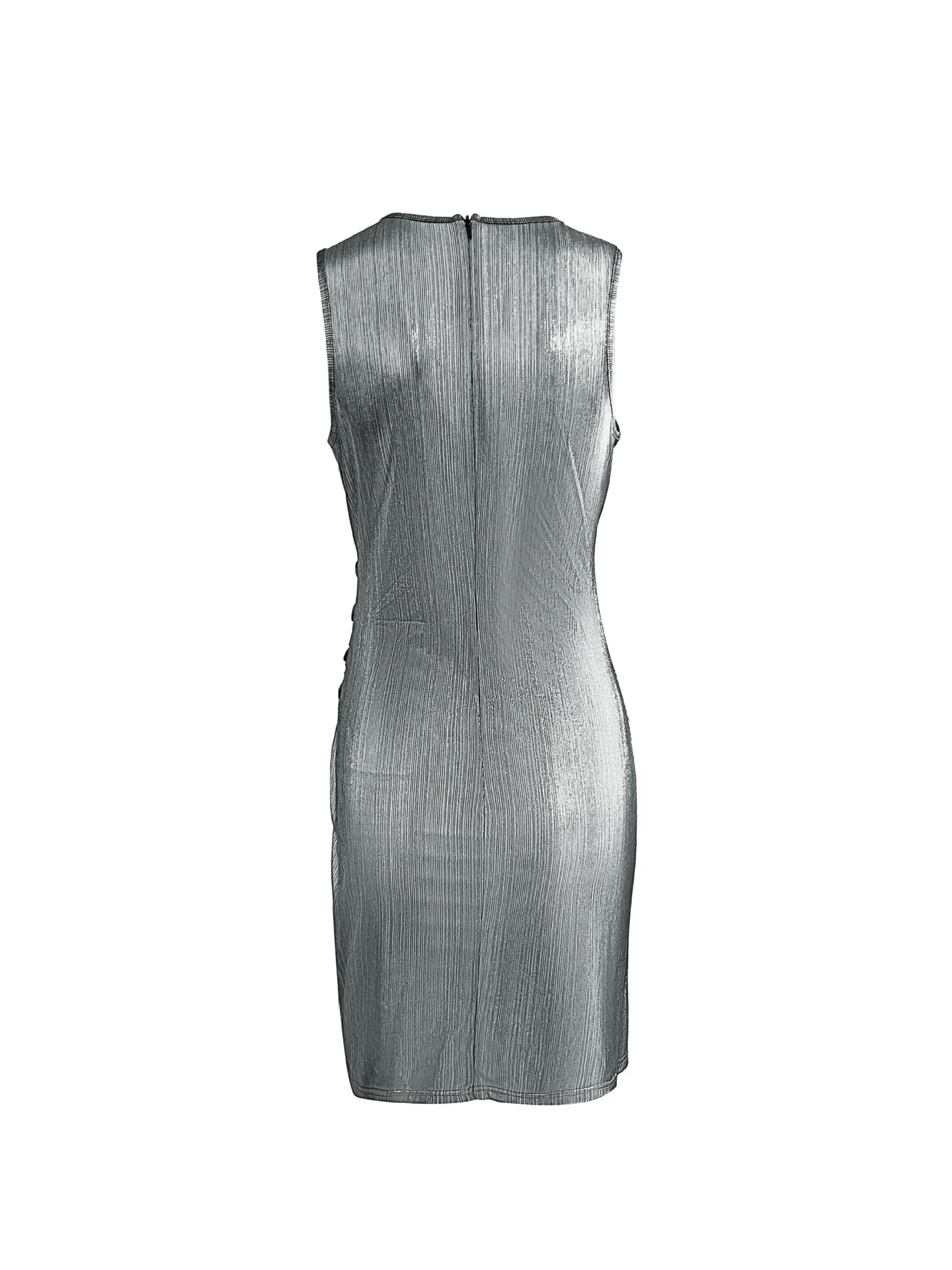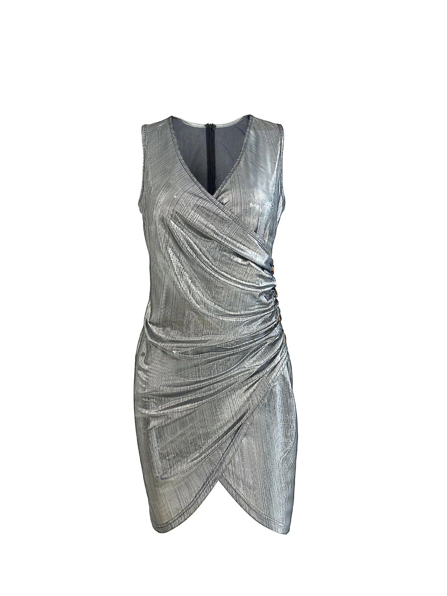 wrapped fashion V-neck casual color blocking button solid metal pleated tight fitting dress